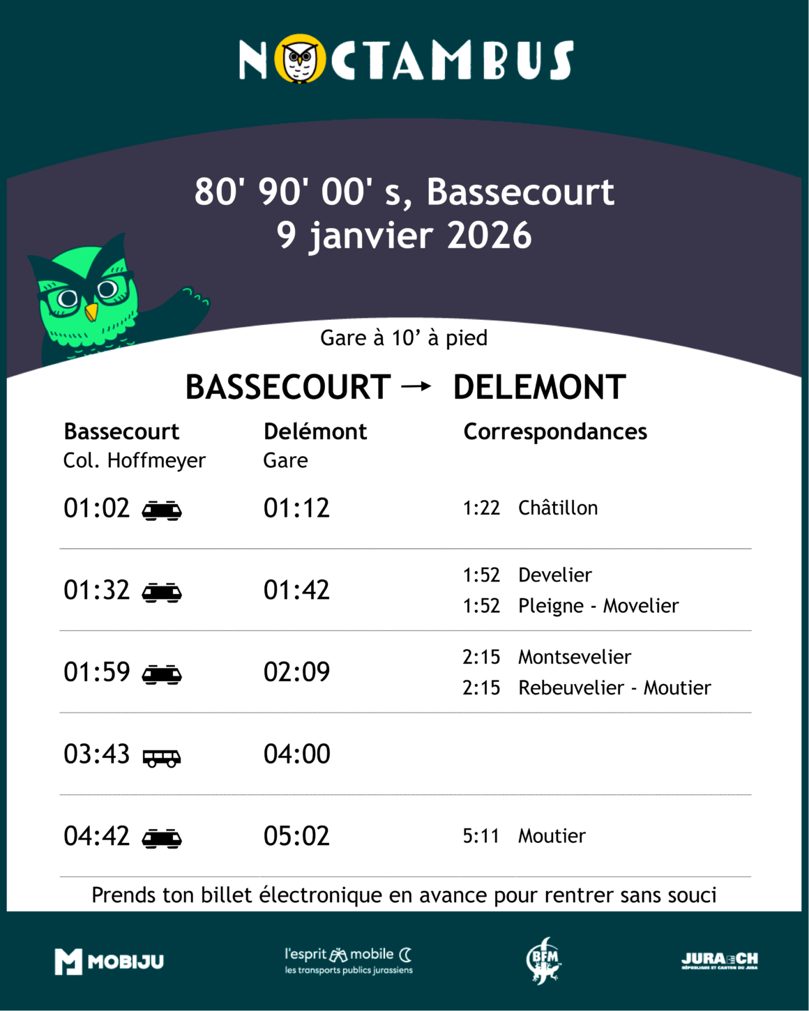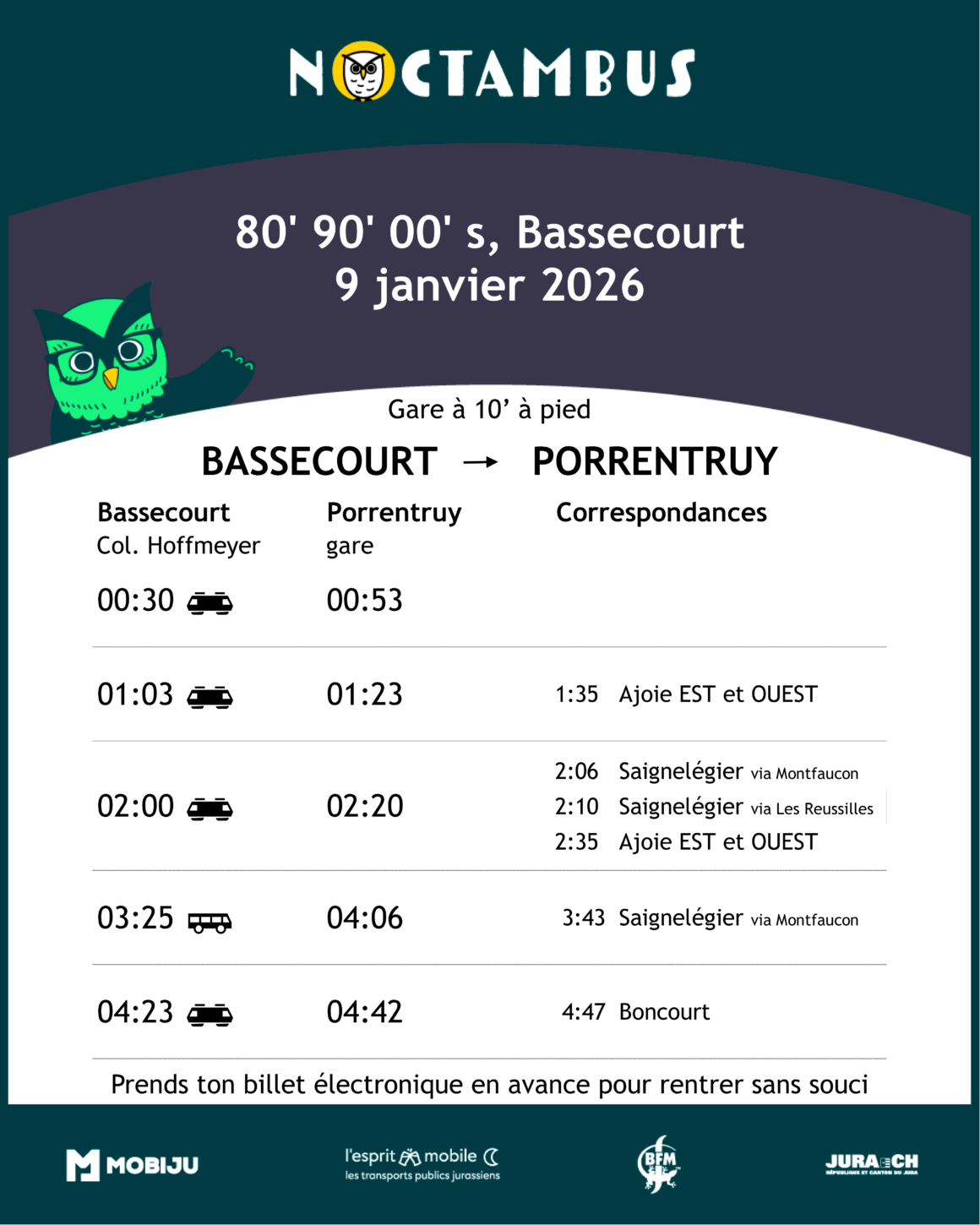 Pour rentrer de la soirée année 80 à 2000 à Bassecourt le 9 janvier 2026, il y a des trains presque toute la nuit. La gare est à seulement 10 minutes à pied de la halle des fêtes. Et lorsqu’il n’y a pas de train, il y a un Noctambus.