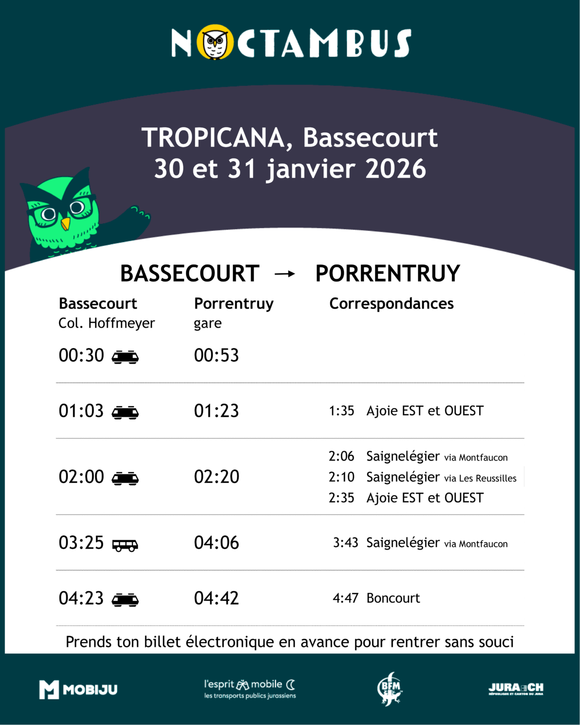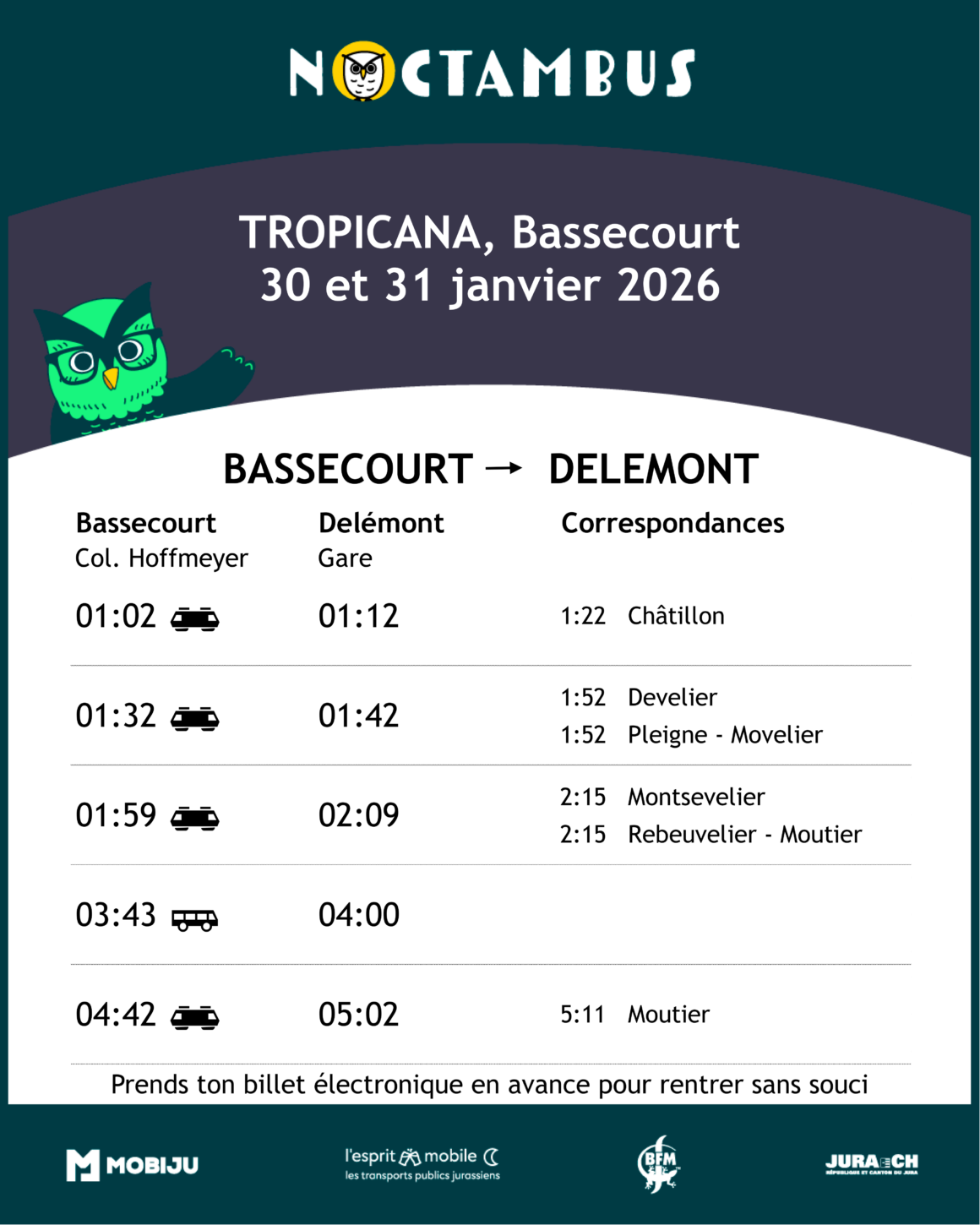 Pour rentrer du Tropicana à Bassecourt les 30 et 31 janvier, vous avez des trains presque toutes la nuit et un Noctambus entre deux trains. La gare est à 10 minutes de la halle des fêtes.