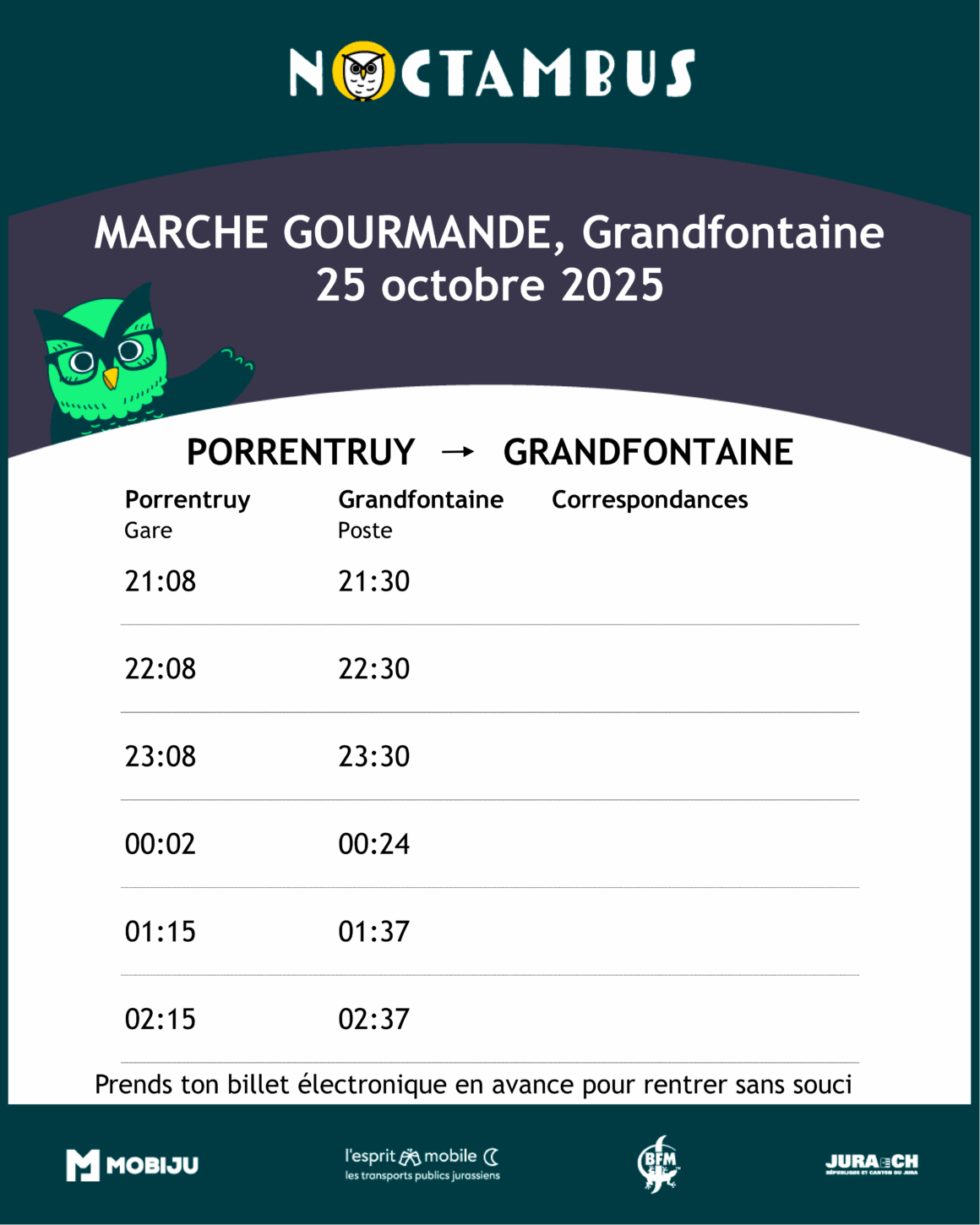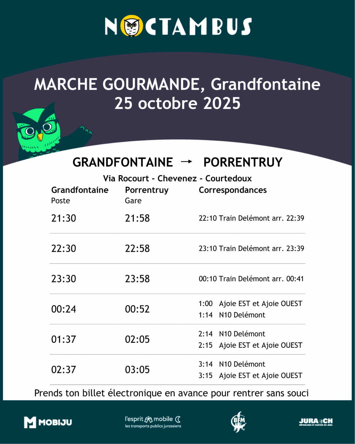 Pour rentrer de la marche gourmande du FC Haute Ajoie à Grandfontaine, utilisez les bus et les Noctambus qui circuleront régulièrement entre Grandfontaine et Porrentruy.