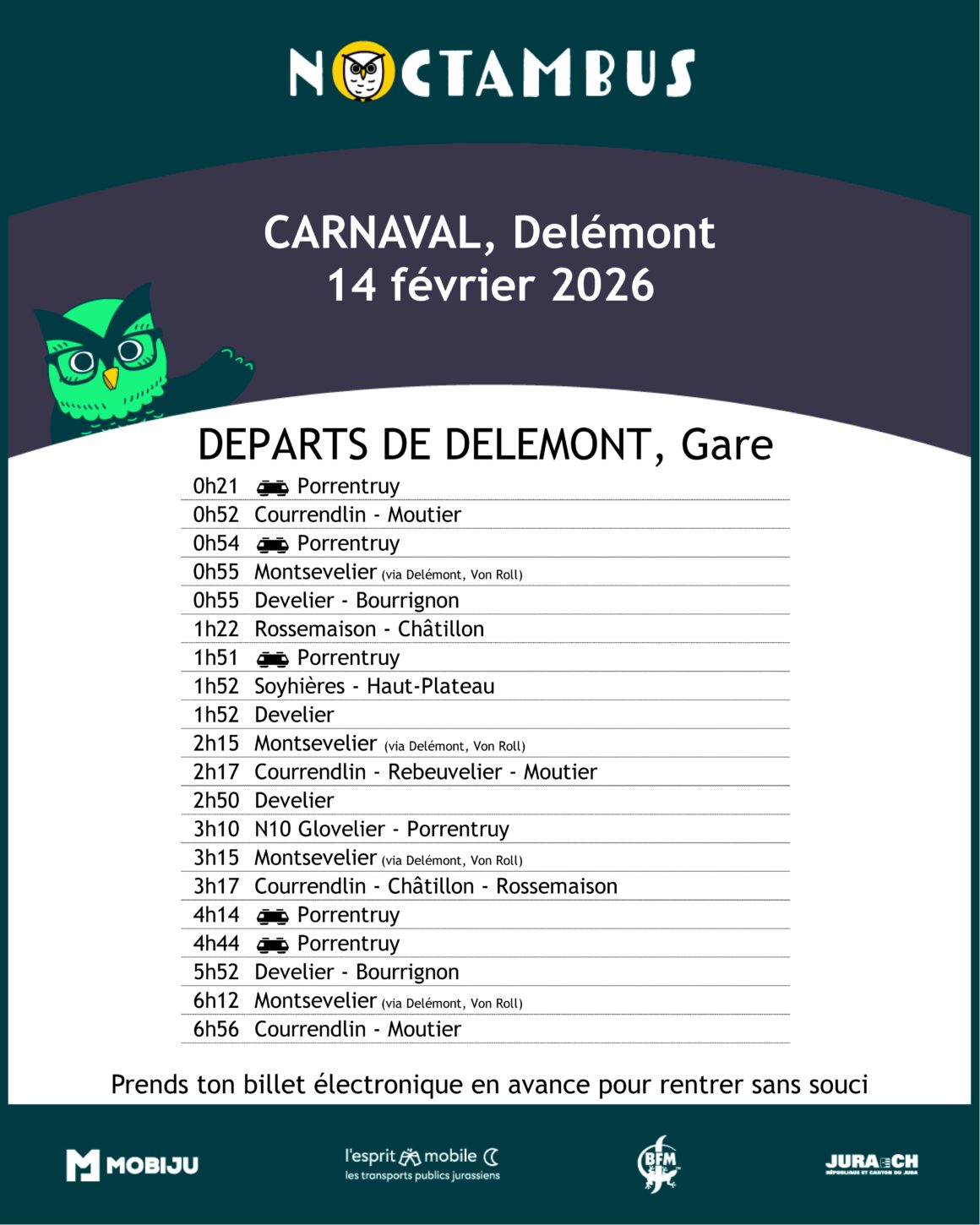 Pensez à utiliser un Noctambus pour rentrer dans votre village lors du carnaval 2026 de Delémont. Sur la ligne CFF, il y a des traisn presque toute la nuit.
