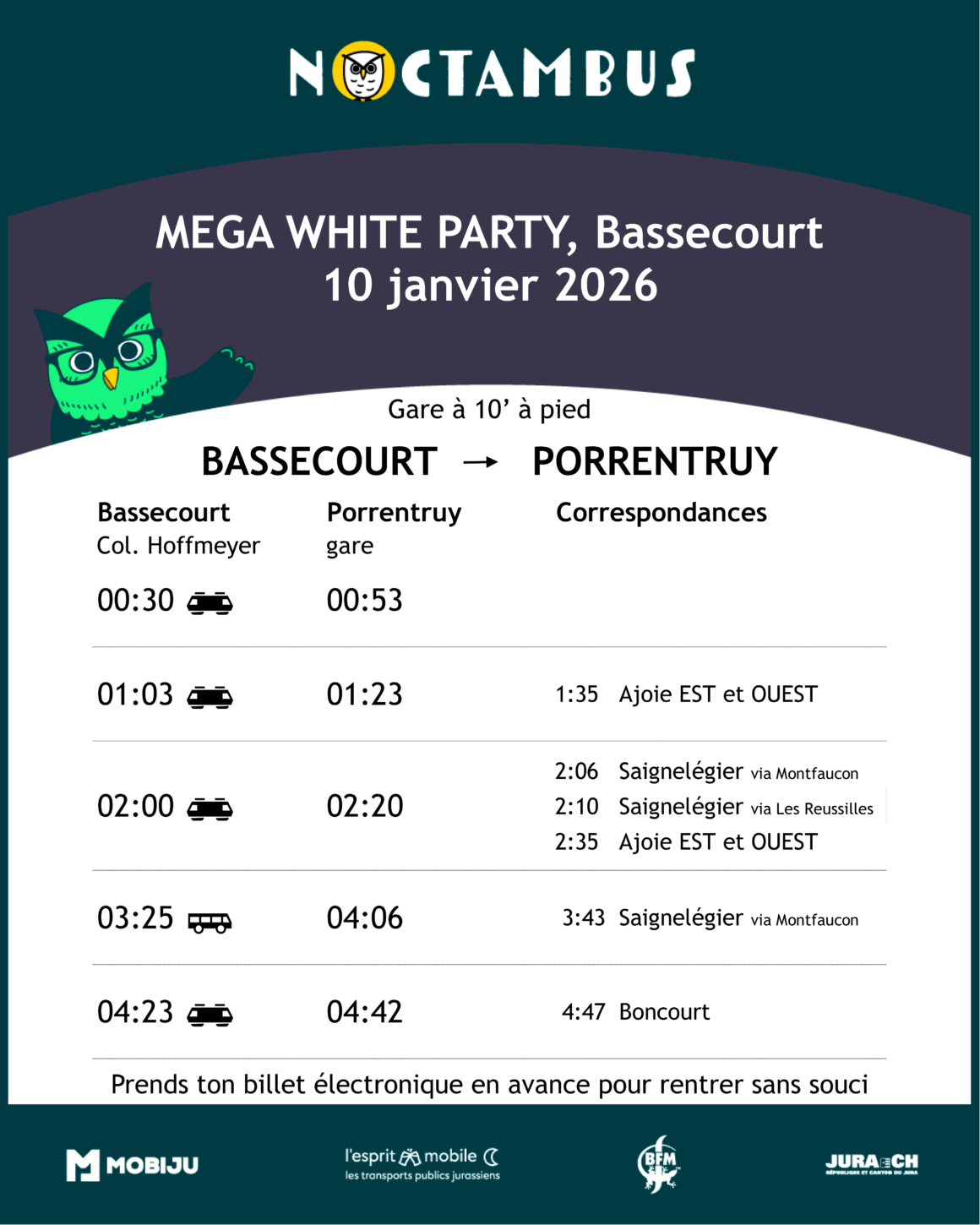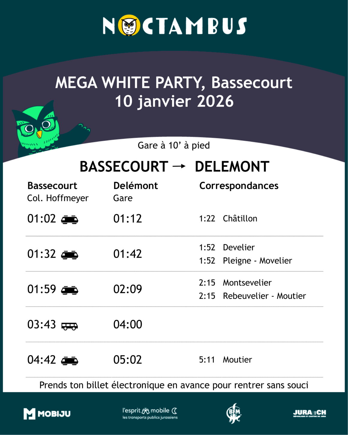 Pour rentrer de la Mega White Party à Bassecourt le samedi 10 janvier 2026, il y a des trains presque toute la nuit. La gare est à seulement 10 minutes à pied de la halle des fêtes. Et lorsqu’il n’y a pas de train, il y a un Noctambus.