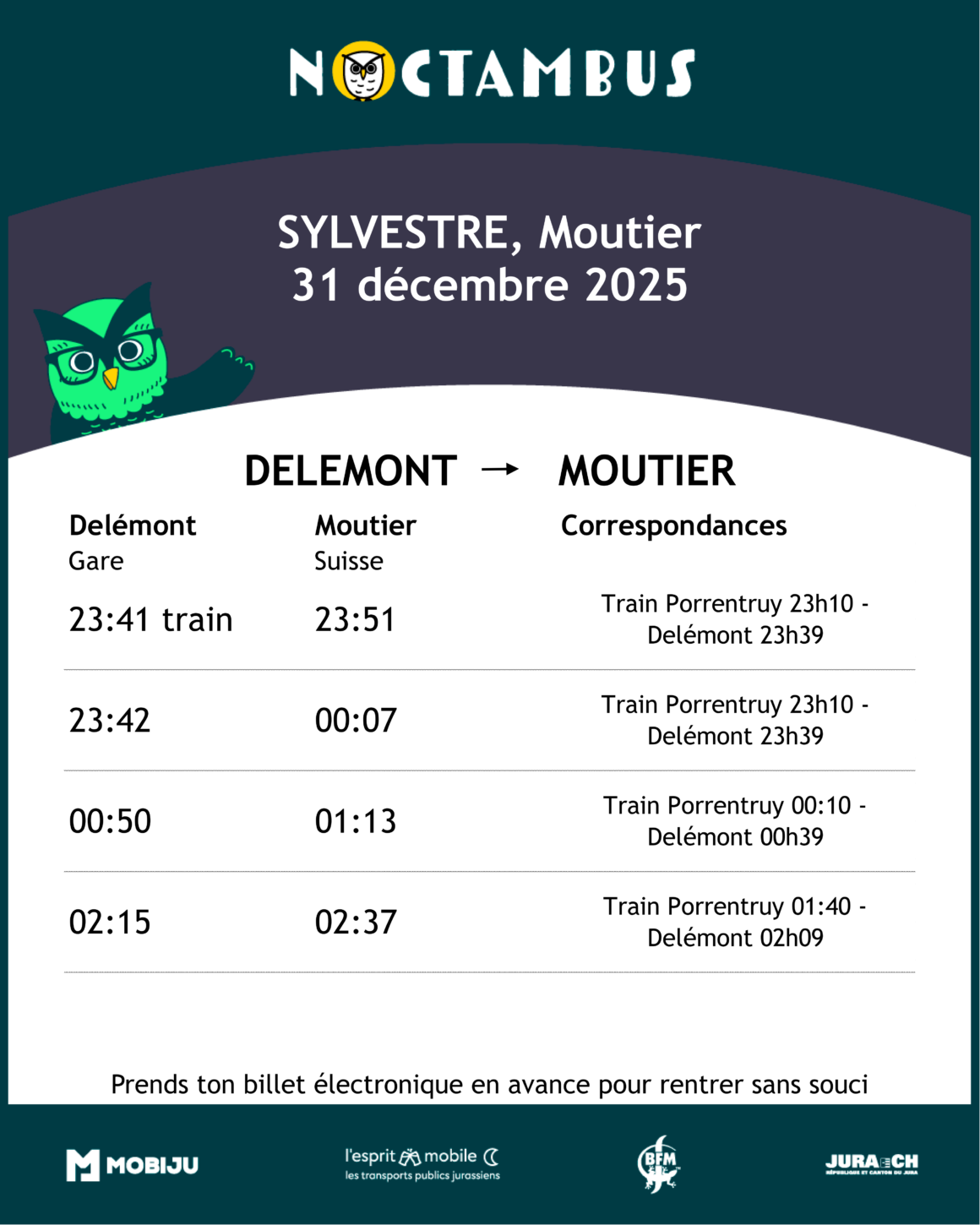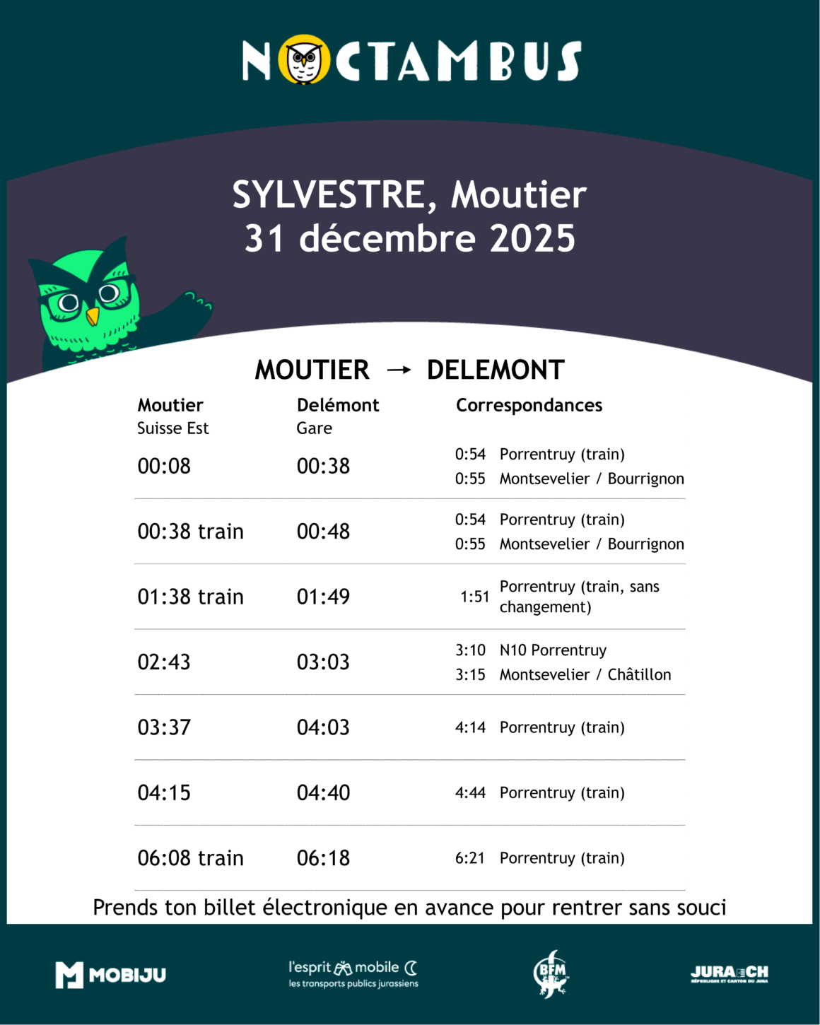 Pour ceux qui rentrent plus tard, un Noctambus supplémentaire partira de Moutier, Suisse Est à 4h15 et donnera correspondance à Delémont au train de 4h44 pour Porrentruy. En descendant à Delémont, gare Sud, vous serez plus rapidement à la voie 2.